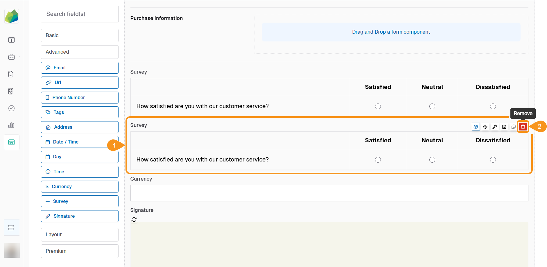 - Within a Form Template, find the Advanced component that you want to remove.